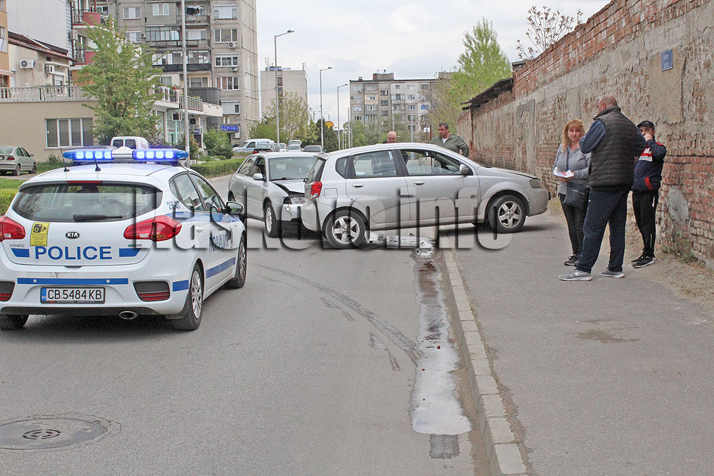 От удара Шевролетът се е качил на тротоара. При инцидента няма пострадали, само материални щети по колите.