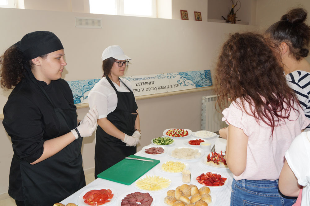 В учебния ресторант гостите участваха в кулинарна игра „Познай вкуса на здравословната храна“. Пробваха уменията си да декорират мини мъфини и бишкоти, както и сами да направят мини хамбургери. В кабинета по сервиране седмокласниците наблюдаваха фламбиране на палачинки и опитаха безалкохолни коктейли.