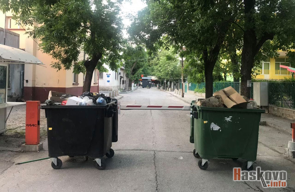 За подсигуряване на забраната за влизане или на шега два контейнера за отпадъци препречиха улица пред бариера зад Община Хасково, сигнализираха читатели на Haskovo.info