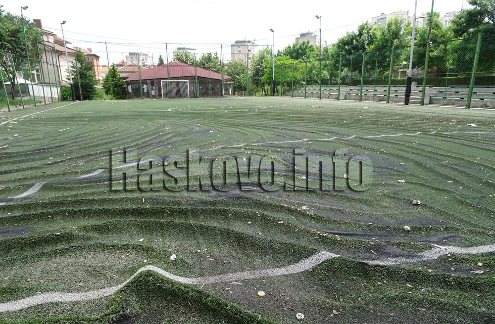 Читатели на Haskovo.info изпратиха снимка на повреденото от пороя на 2 юни игрище на комплекс „Авеню“ в Хасково.