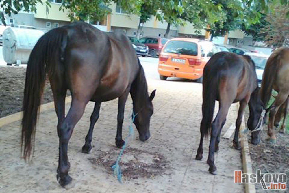 За сутрешна разходка на коне до блок 31 в хасковския квартал „Орфей“ сигнализираха със снимки читатели на Haskovo.info.