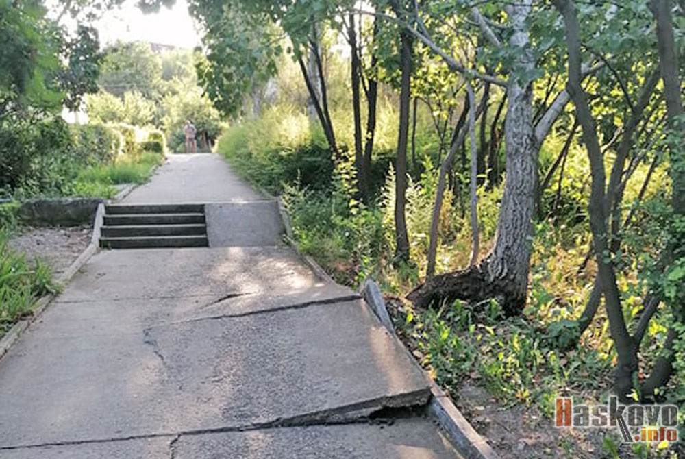Наклонено дърво от силния вятър снощи е изкъртило настилката в парка под Езиковата гимназия „Асен Златаров“ в Хасково.