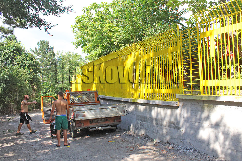 Металните пана на новата ограда на стадион „Хасково“ вече са монтирани. Сега работници ги пребоядисват в жълт цвят.
