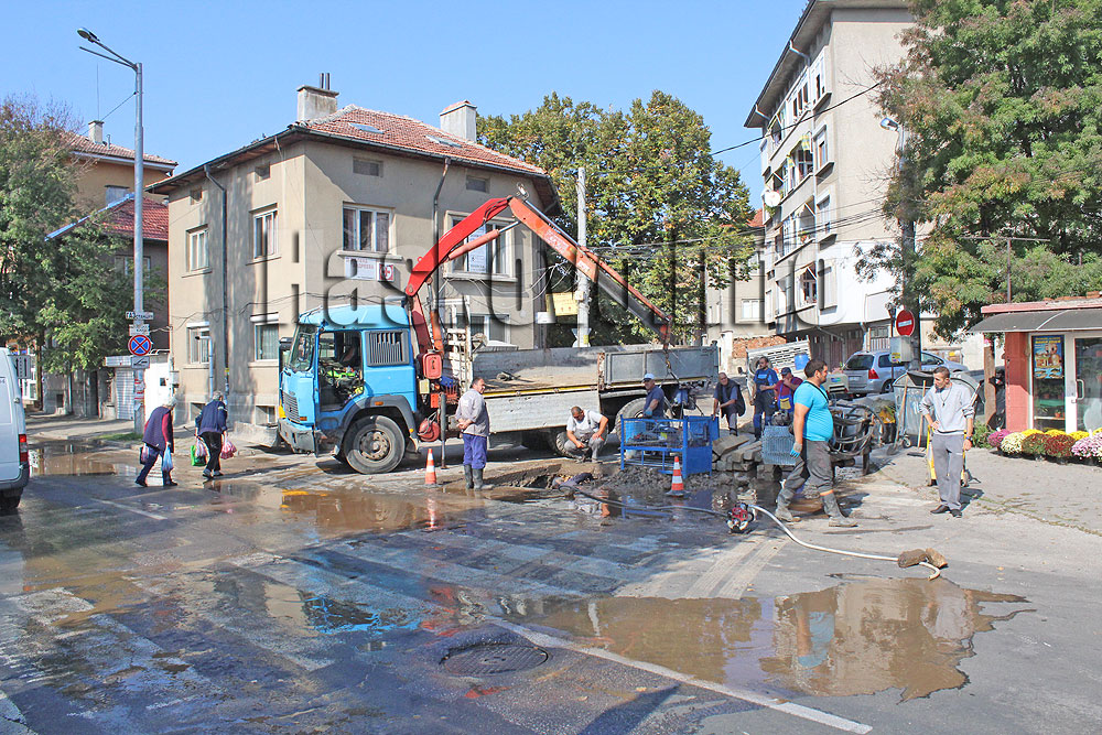 Аварията е срещу пешеходния мост до зеленчуковия пазар на булевард „България“. В района има струпана тежка техника, като пресечките са затворени за движение. По булевардното платно се стича вода.