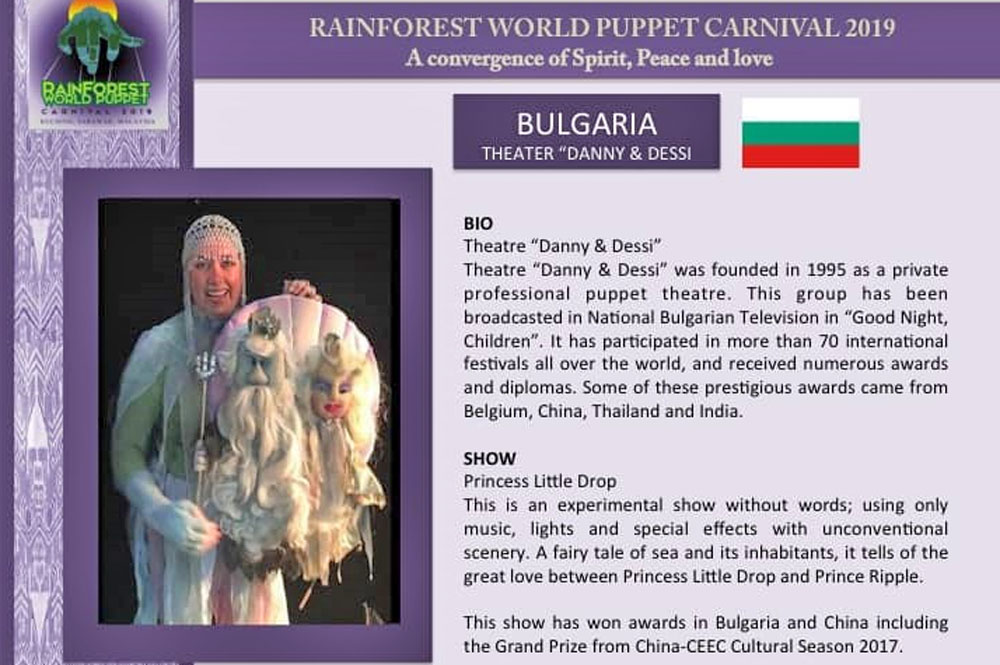 Поканени сме сред 700 кандидатстващи трупи от целия свят, каза преди заминаването арт директорът Таня Евтимова. На сцената в едномилионния град Кучинг „Дани и Деси“ ще играе спектакъла „Принцеса Капчица“. Във фестивала, който ще продължи до 17 ноември, ще участват трупи от Мексико, Казахстан, Корея, Албания, Бразилия, Индия, Филипините, Перу, Румъния, Австралия, Виетнам, Бразилия, Китай, Турция, Индонезия, Аржентина, Русия и България.
