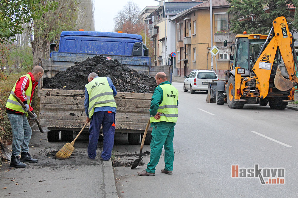 Работници на общинското предприятие „Екопрогрес“ чистят шахтите по булевард „България“ в Хасково.