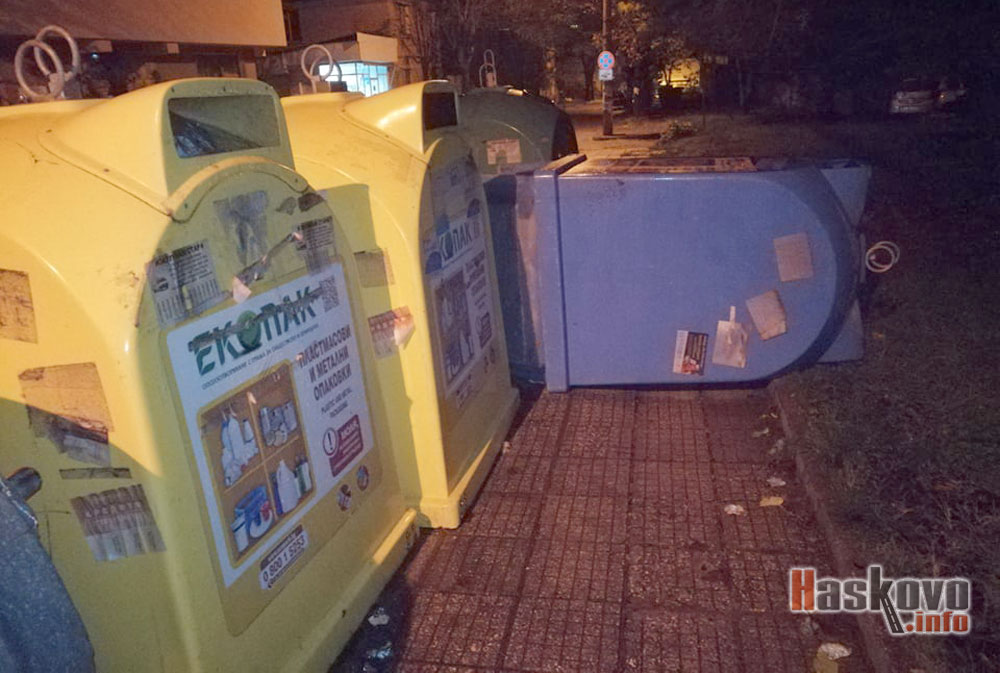 Контейнер от разделното сметосъбиране е обърнат и запушва тротоара на хасковската улица „Георги Кирков“.