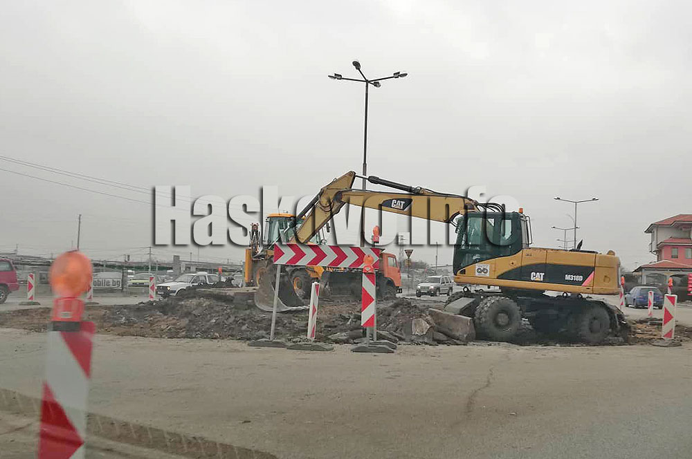 С тежка техника вече е разбит бетонът на кръговото на изхода на Хасково за Кърджали. Сваля се и неговото ниво.