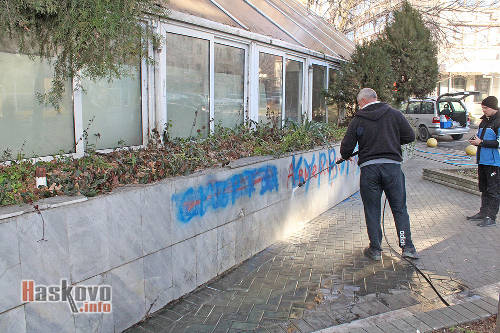 Тази сутрин работници почистиха надписи от стена на площад "Атлантически" в Хасково.