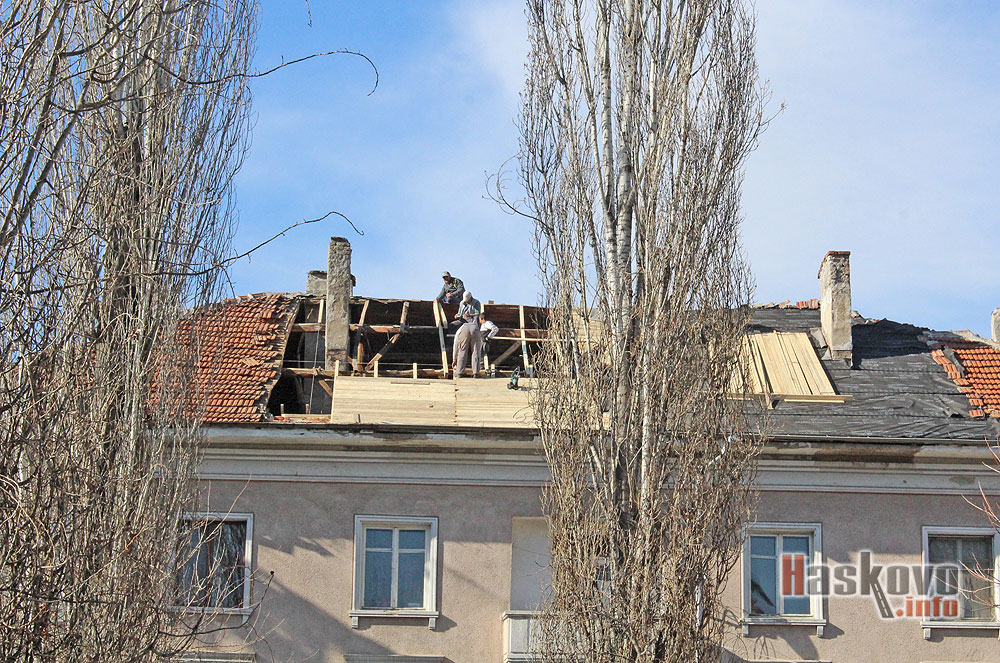 Работници без предпазни средства ремонтират покрива на жилищен блок в центъра на Хасково.