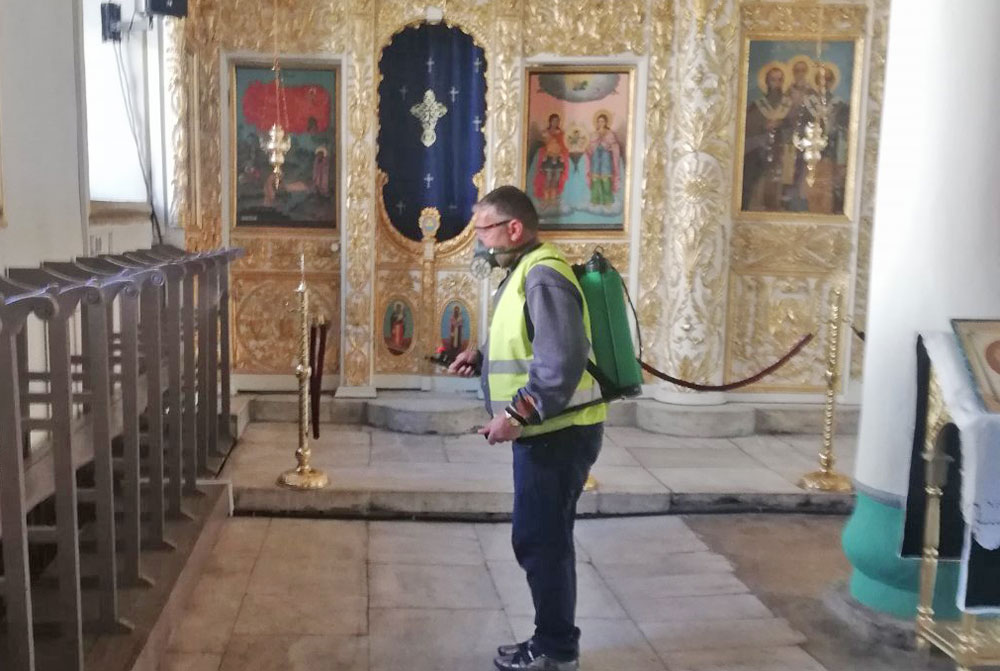 С препарати са обработени пространствата около и вътре в храмовете. Местата за сядане и иконите също са дезинфекцирани. Утре дезинфекция ще се извършва периодично от църковните служители.