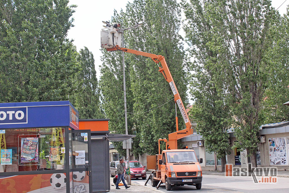 Работници ремонтират повредени лампи по булевард "България" до комплекс "21 век" в Хасково.