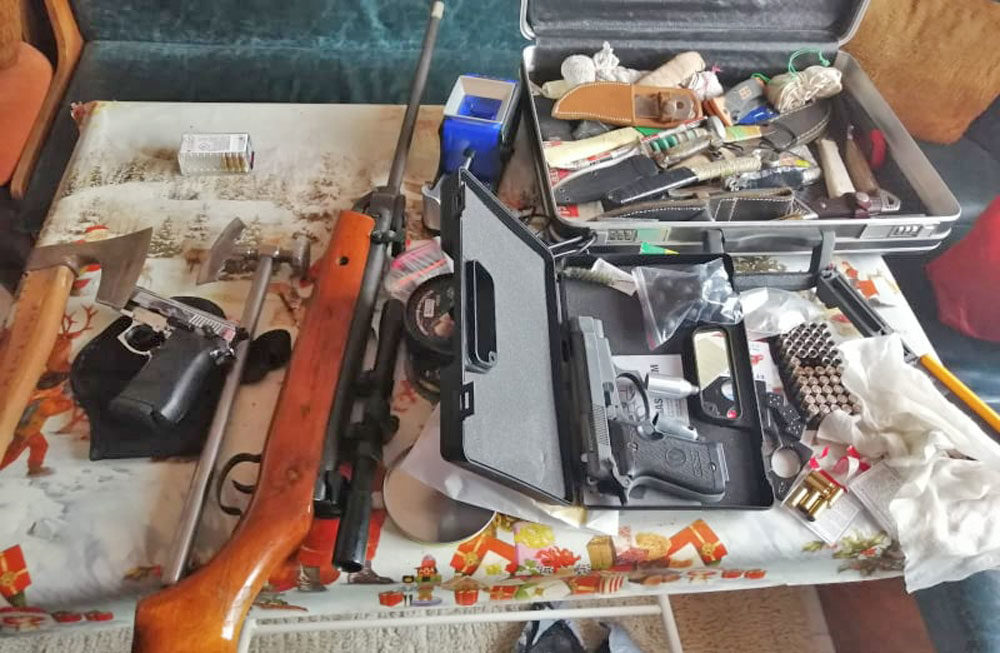 В дома на 20-годишния в хасковския квартал „Бадема“ са открити пистолет – 9 мм., пушка с дървен приклад и монтиран оптически прицел, пистолет с 11 газови патрона, покривател за оръжие, кутия с бутони и светлини – външна батерия, която при отваряне е разпределена като класьор. Намерени са сгъвки с бяло прахообразно и бяло кристалообразно вещества и синя таблетка с изображение. В кутията е имало множество гилзи и патрони за ловна пушка, автомат и малокалибрено оръжие.