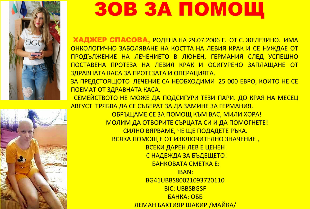 14-годишната Хаджер Спасова от ивайловградското село Железино страда от онкологично заболяване на костта на левия крак.