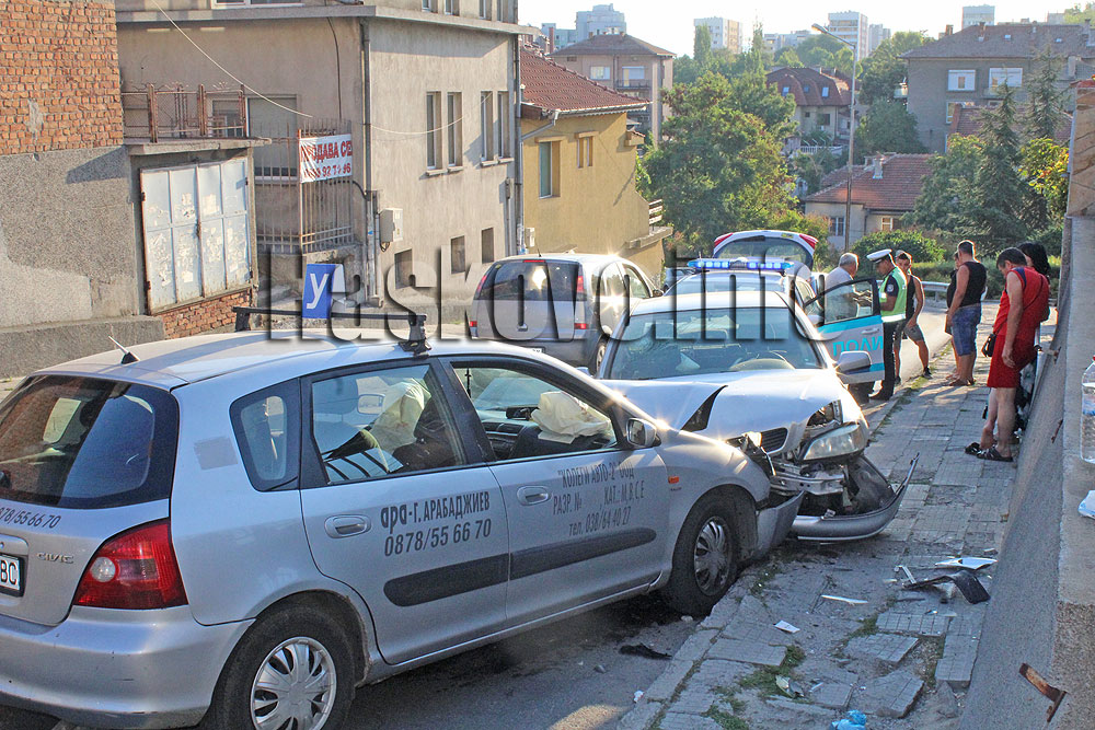 Инцидентът стана преди 19 часа на наклонения участък след кръстовището с улица „Георги Кирков“. Двете коли са се ударили челно. Учебната кола, шофирана от курсистка, се е спускала, а Опелът се е изкачвал по улицата.