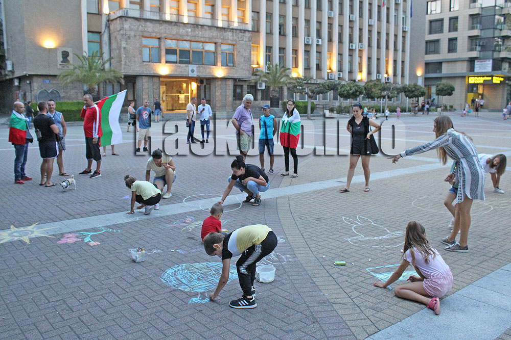 Тази вечер протестиращите отново се събраха на площад „Свобода“, но както обявиха по-рано през деня, те дойдоха с децата си и поканиха хасковлии да сторят същото. От колоната, по която традиционно звучи патриотична музика, този път бяха пуснати детски песнички. Малчуганите и техните родители рисуваха с тебешири на площада.