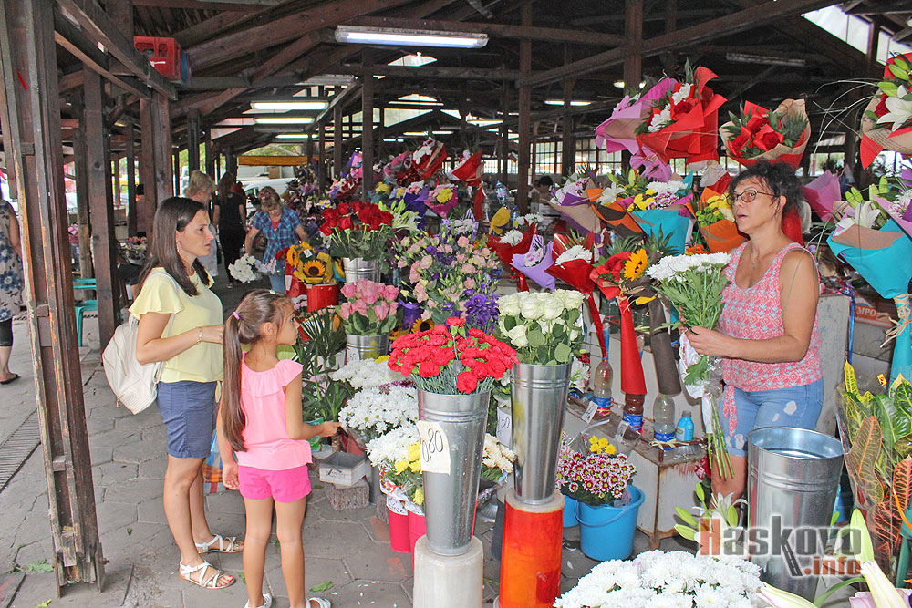 Родители и деца от сутринта купуват цветя в Хасково за утрешния първи учебен ден.