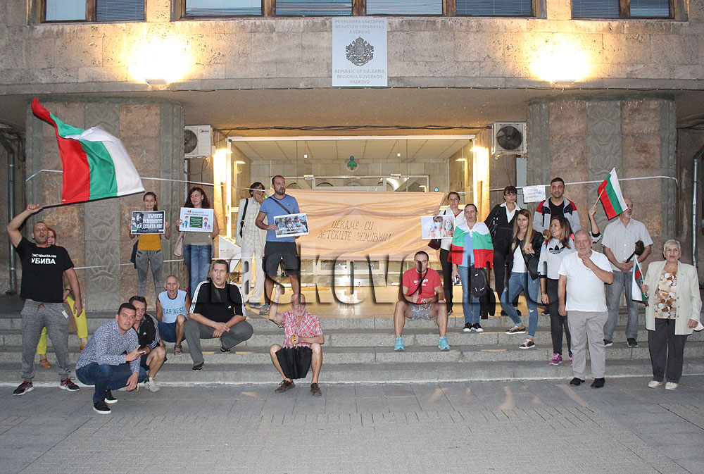 В края всички опънаха голяма маска с надпис „Искаме си детските усмивки!“ на входа на областна администрация. Стоянов каза, че посланието им е, че освен депутати в тази държава има и деца. Желанието на протестиращите е правилата да са еднакви за всички.