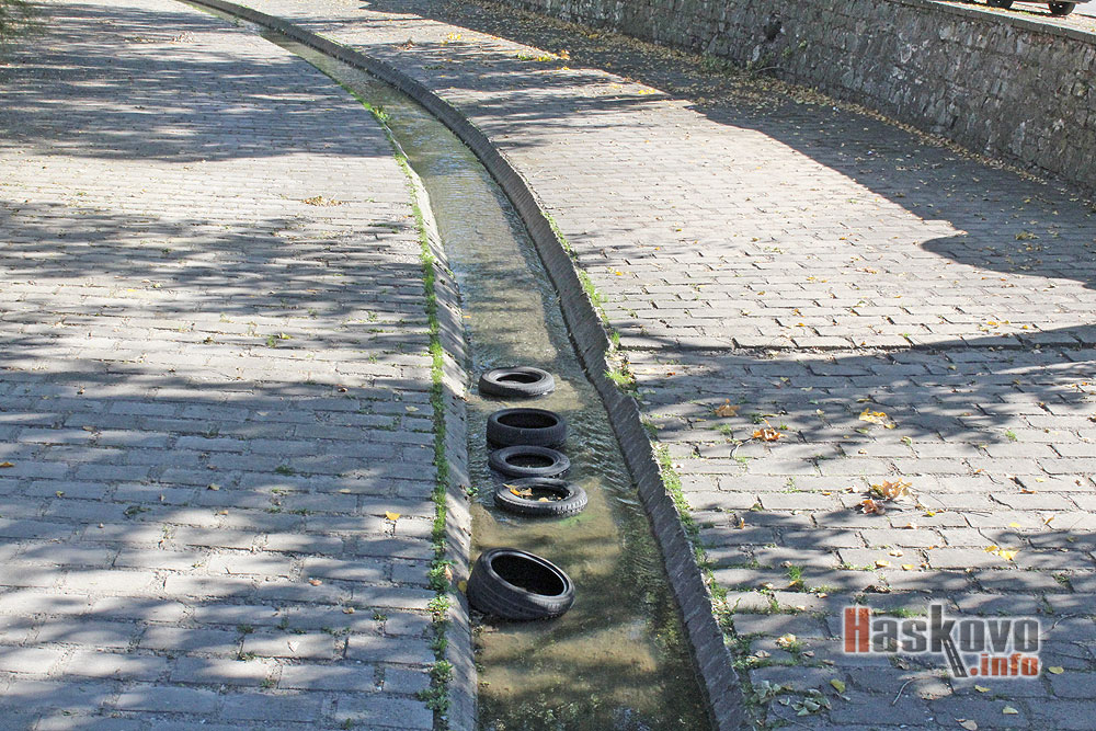 Стари автомобилни гуми са изхвърлени в хасковската река до Градската градина.