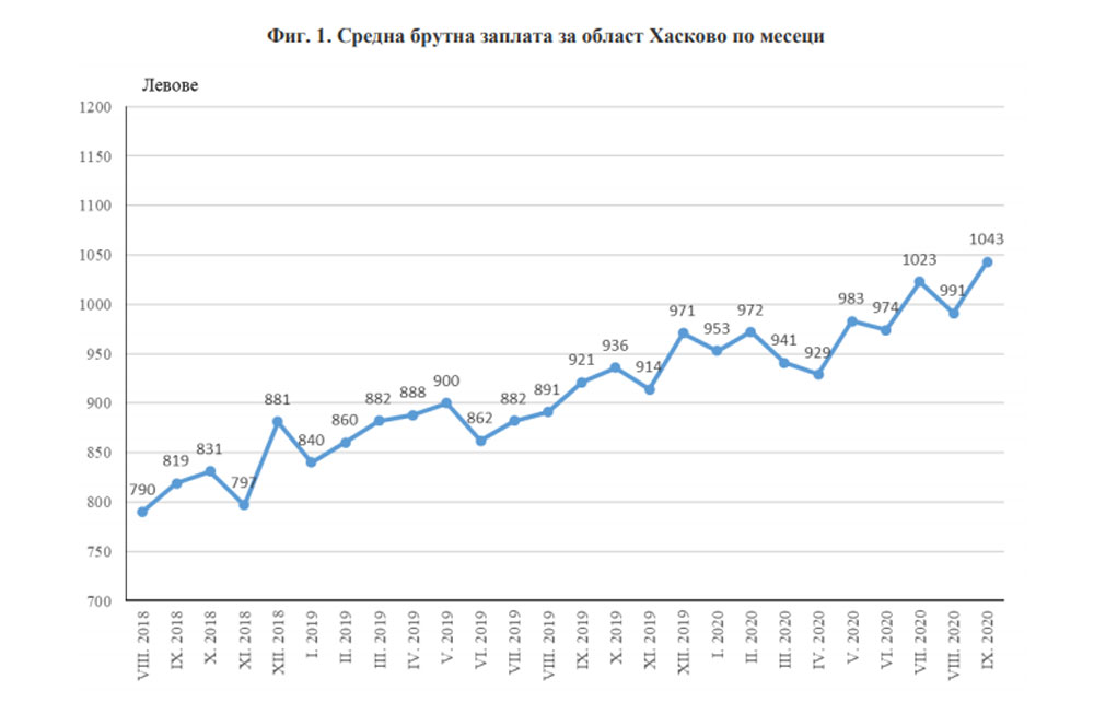 С най-висока заплата е София – 1 855 лв., а с най-ниска област Благоевград – 922 лв. За периода средната заплата за страната е 1 373 лв. – с 354 лв. по-висока от тази за Хасковска област.