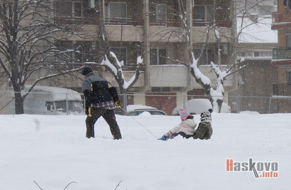 Деца се повозиха на шейна в снега пред хасковската спортна зала "Спартак".