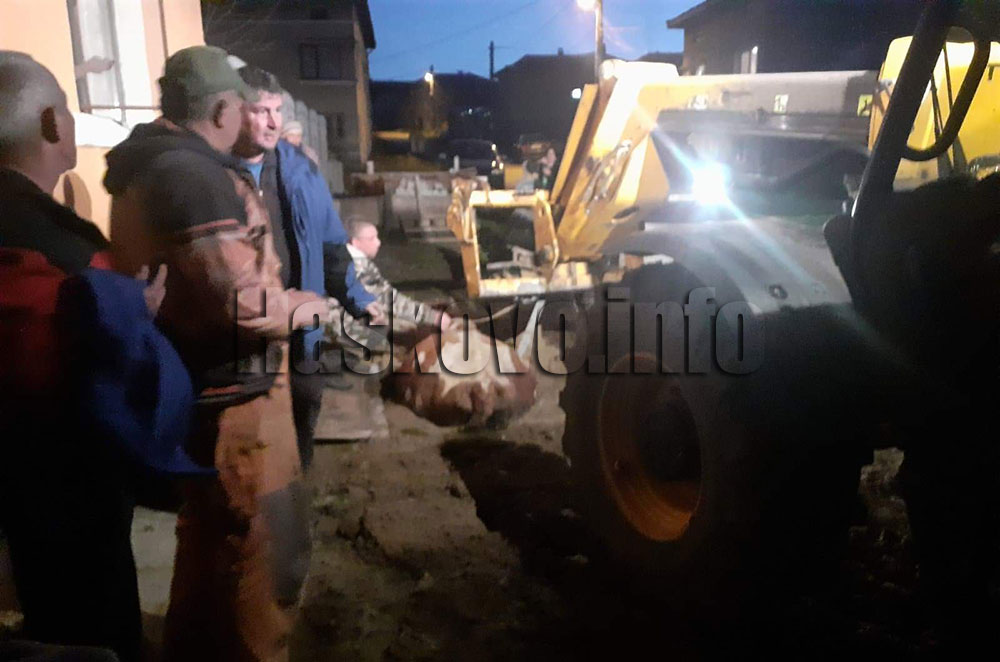Екип на водното дружество разкопал тротоар в селото преди дни за отстраняване на авария и след това запълнил дупката с пръст, която обаче се превърнала в рядка кал. Тази вечер при прибиране от паша една от кравите пропаднала в ямата и не успяла да излезе.