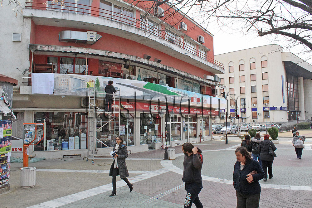 От днес тя рисува на терасата срещу театър „Иван Димов“. 25-метровото платно пресъздава гледката, която се открива от голямата тераса. Работата трябва да приключи до края на следващата седмица, а произведението й да остане там до края на годината.