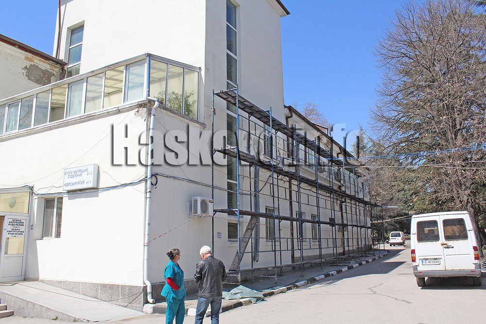 Междувременно започна ремонт на фасадата на една от сградите в болницата, от която през зимата паднаха големи парчета мазилка.