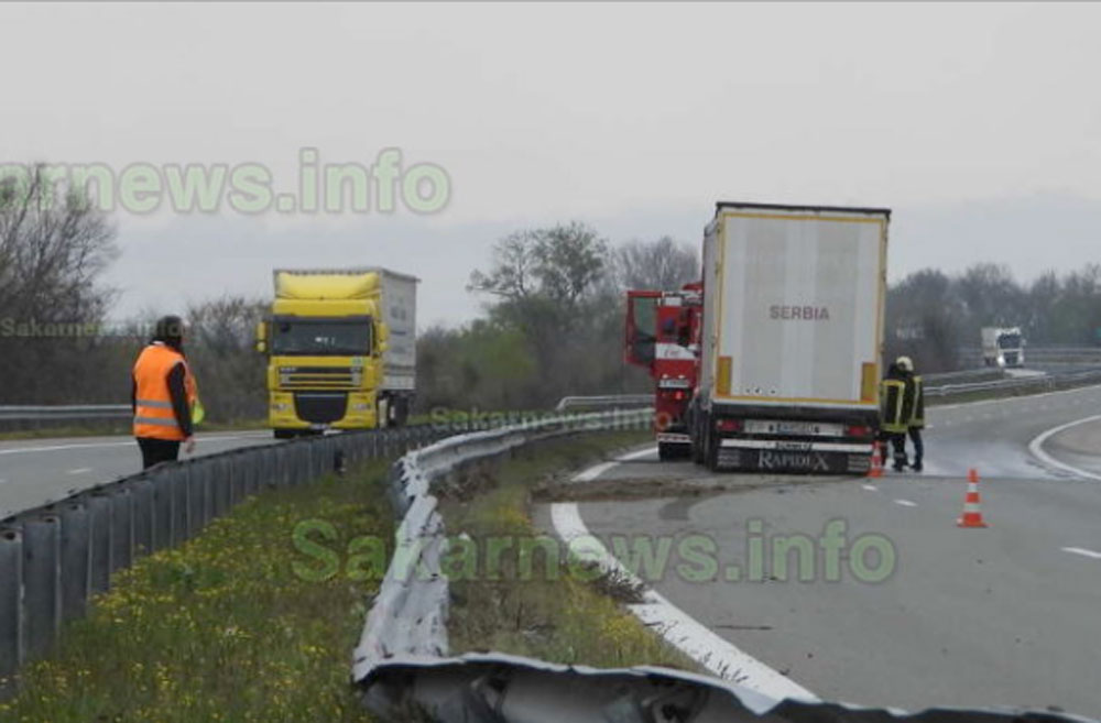 При произшествието няма пострадали. След катастрофата тирът е изтеглен в аварийната лента и не пречи на движението, допълниха от Пътното.
