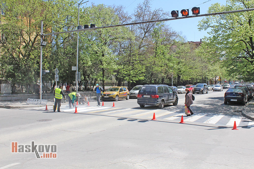 Пешеходци и автомобили си проправят път между конусите, пазещи новата боя по пешеходните пътеки в Хасково.