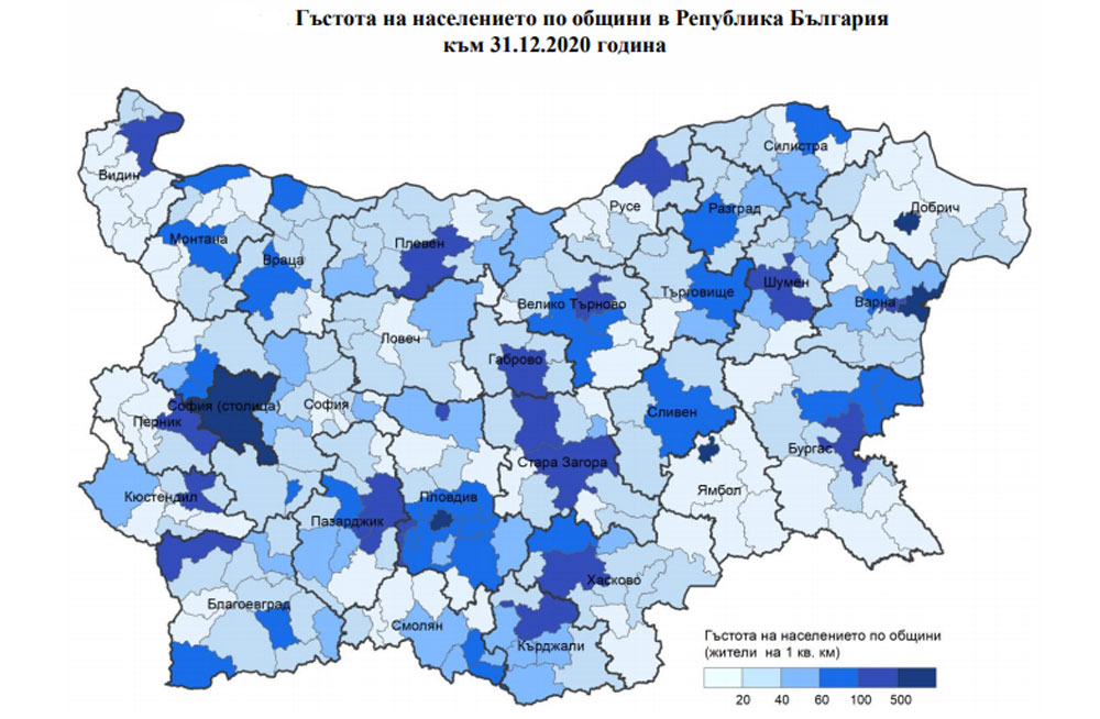 На първите три места по население в страната са София – 1 221 785 жители, Пловдив – 342 048 и Варна – 332 394.