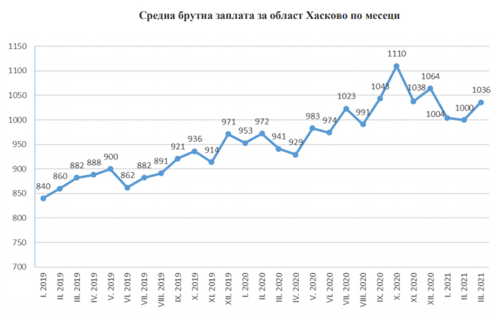 Средната брутна месечна работна заплата в Хасковска област за януари 2021 г. е 1 004 лв., февруари – 1 000 лв. и март – 1 036 лв.