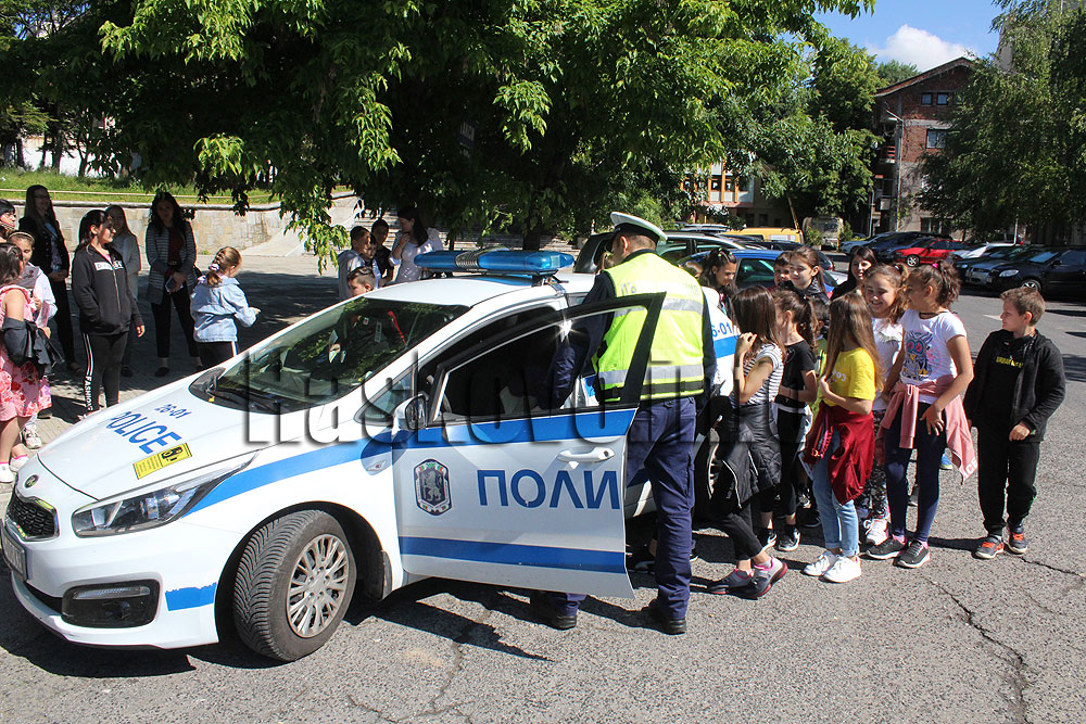 От КАТ направиха и специална демострация за ученици от СУ „Васил Левски“. Децата имаха възможност да разгледат и отвътре полицейски автомобил.