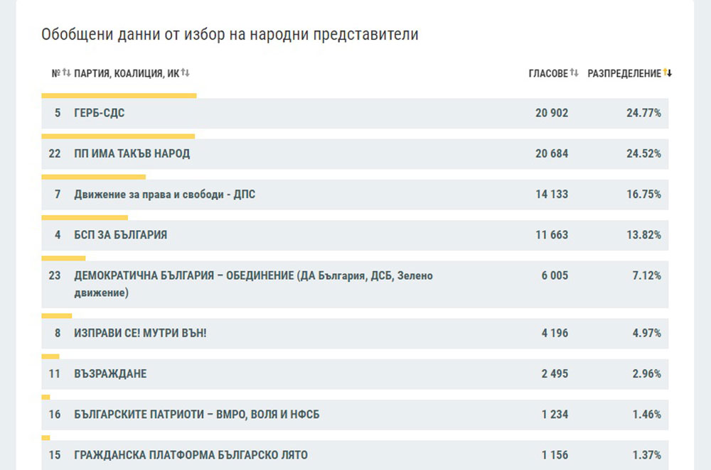Гласовете за ГЕРБ са 20 902, или 24.77%, а за ИТН – 20 684 (24.52%). Трети са ДПС с 14 133 гласа и 16.75%, следвани от БСП с 11 663 гласа (13.82%), Демократична България – 6 005 (7.12%) и Изправи се! Мутри вън! – 4 196 (4.97%).