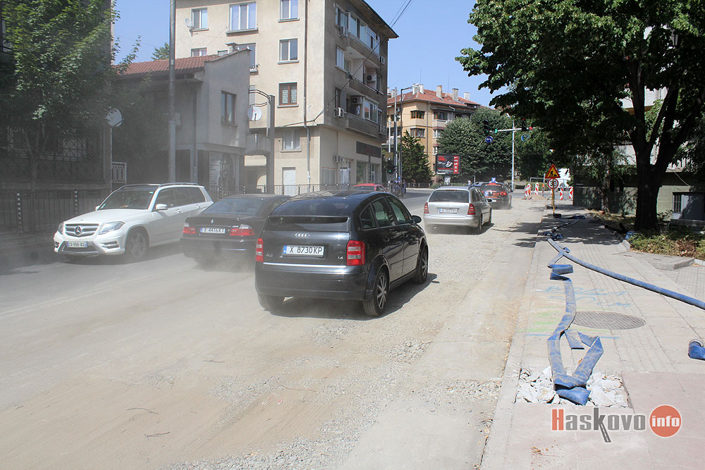 След смяната на водопровод отвориха за движение участъка от бул. „Съединение“ между бул. „България“ и бул. „Раковски“. Заради неасфалтираното платно обаче това доведе до облаци от прах.