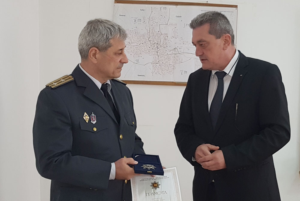 Главен комисар Николай Николов връчи почетен медал за професионализъм на главен инспектор Петър Виденов на церемония в Хасково, съобщават от областната дирекция на МВР.