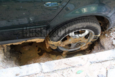 Колата е била паркирна върху стара авария. През нощта там е избил нов теч и едно от задните колела на колата е пропаднало. Заради силния теч водата е стигнала до училище „Васил Левски“.