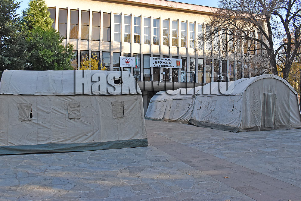 Военни започнаха преди обяд да разпъват 4 палатки пред централния вход на спортна зала „Дружба“ в Хасково.