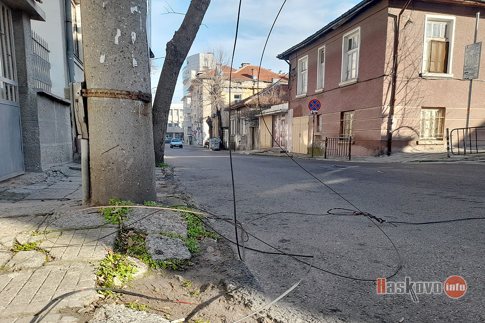 Скъсани кабели висят на улица "Проф. Александър Танев" в Хасково.