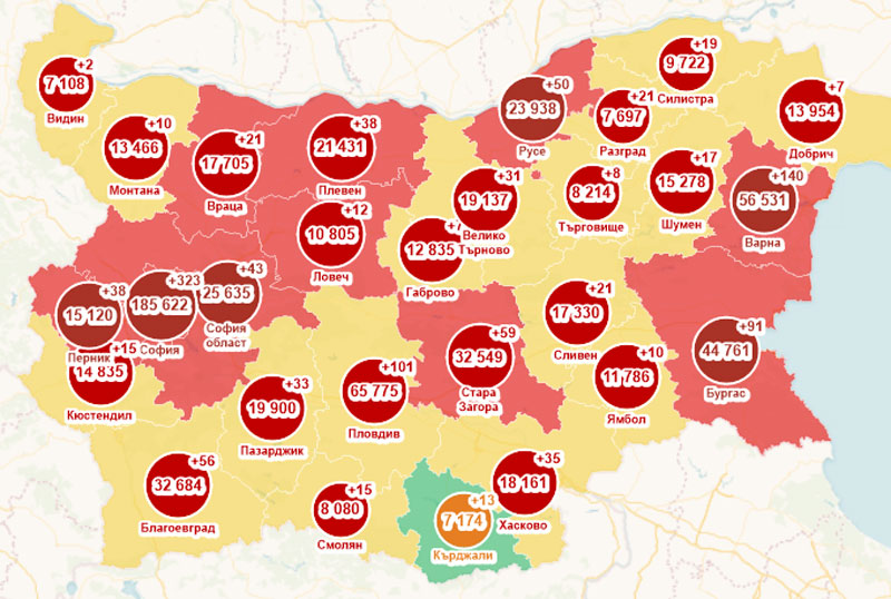 Хасковска област излезе от червената зона по заболеваемост от COVID-19. 14-дневната заболеваемост е вече 239 на 100 000 души и регионът е в жълтата зона.