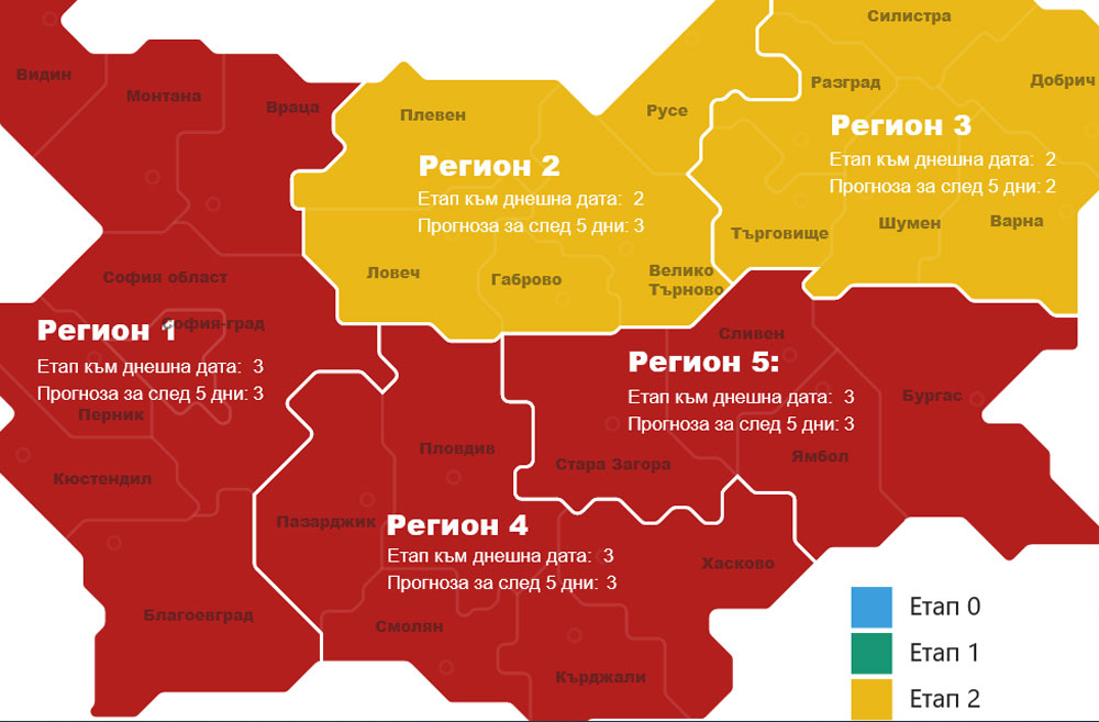 Регион 4, в който влизат областите Хасково, Пловдив, Кърджали, Смолян и Пазарджик влезе в етап 3 на Националния оперативен план за справяне с пандемията. Той включва взимането на няколко мерки. 50% от паралелките с ученици от 5 до 12 клас трябва да учат присъствено на ежеседмична ротация. Капацитетът на заведенията трябва да е до 50%, а работното им време да е до 22 часа. Задължително въвеждане на дистанционна форма на работа и при възможност очестяване графика на движение на градския транспорт. Днес ще има заседание на областния оперативен щаб в Хасково, на което ще бъдат обсъдени новите мерки.