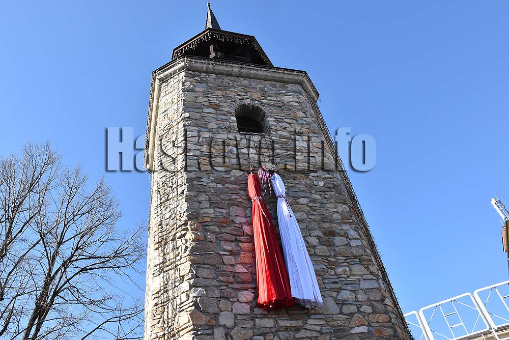 3-метрова мартеница беше закачена днес с помощта на вишка на старата часовникова кула в центъра на Хасково.