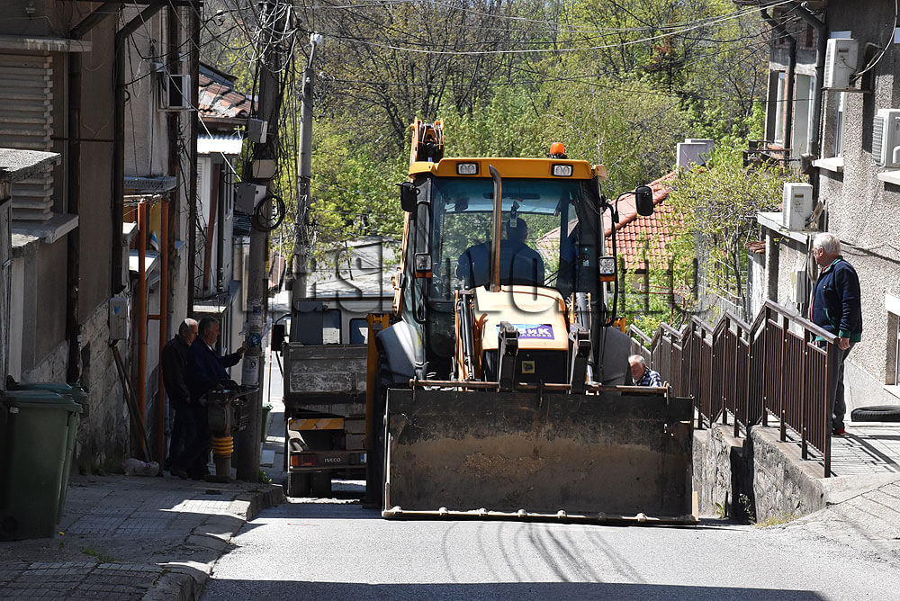 Стръмната уличка, която свързва улица „Георги Кирков“ с площад „Спартак“ е разкопана на 6 места. 5 от тях са за отстраняването на аварии по стария водопровод, а шестото е за монтирането на кран, откъдето да се спира водата при проблем.