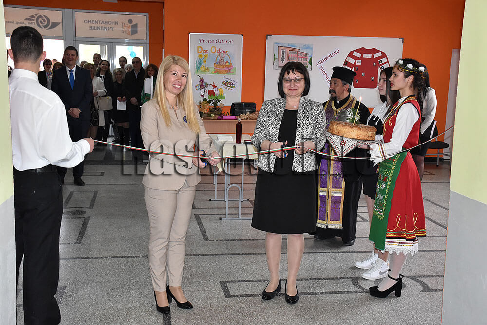 Водосветът отслужи отец Димитър, а символично лентата прерязаха заместник-министърът на образованието Мария Гайдарова и директорът на ПМГ Гергана Петрова. Преди това те поздравиха учениците и учителите, а Гайдарова дари книги на гимназията. Кметът Станислав Дечев каза в словото си, че днес празнуват и всички завършили гимназията през годините, като него. Градоначалникът връчи на Петрова кристална статуетка на Св. Богородица, която да закриля всички в гимназията.