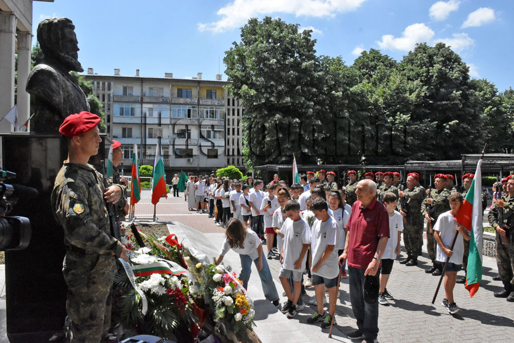 Христо БотевСтотици деца и възрастни се стекоха минути преди воя на сирените на площад „Освобождение“ да изразят признателността си към героите на България. Деца бяха почетен караул от гвардейци пред паметника. Програмата започна с изпълнение на Забавно-духовия оркестър с диригент Георги Желев, а деца от четвърта група на Детска градина №4 „Пролет“ изнесоха рецитал и изпълниха „Тих бял Дунав“.