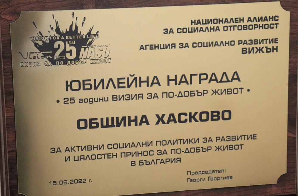Голямата награда за Активни социални политики за развитие и цялостен принос за по-добър живот е получила община Хасково, наред с Варна и Търговище, съобщават от кметството.