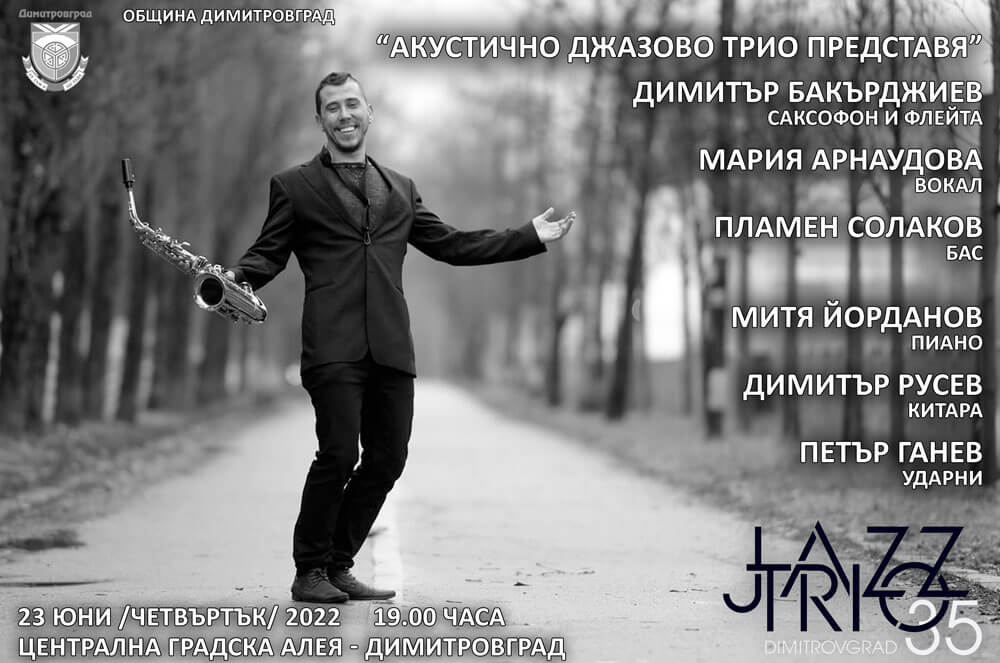 На 23 юни от 19 ч. на централната алея триото ще представи младия и талантлив Димитър Бакърджиев – саксофон и флейта. В концерта ще вземат участие солиста на Акустично джаз трио Мария Арнаудова, Пламен Солаков – бас, Митя Йорданов – пиано, Димитър Русев – китара и Петър Ганев – ударни.