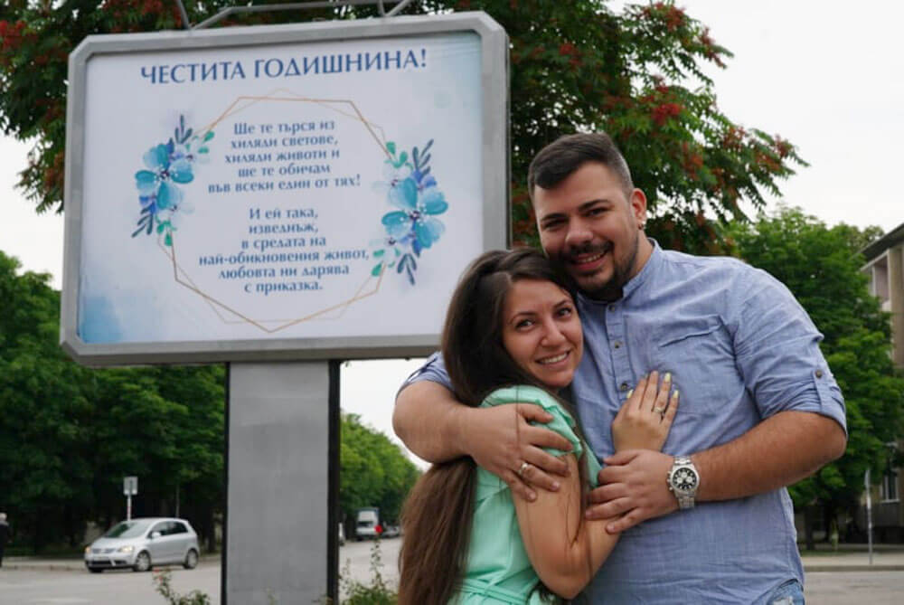Георги Гочев засвидетелства чувствата си към своята съпруга Нора по повод първата годишнина от сключения граждански брак с романтично обяснение в любов от билборд на булевард „Раковски“ в Димитровград.