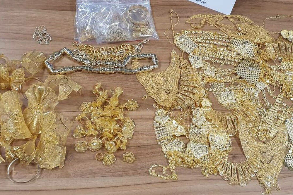 Според експертизата на вещото лице откритите 1 838,20 грама бижутерийни изделия са от 14-каратово злато и са на обща стойност 165 438 лева.
