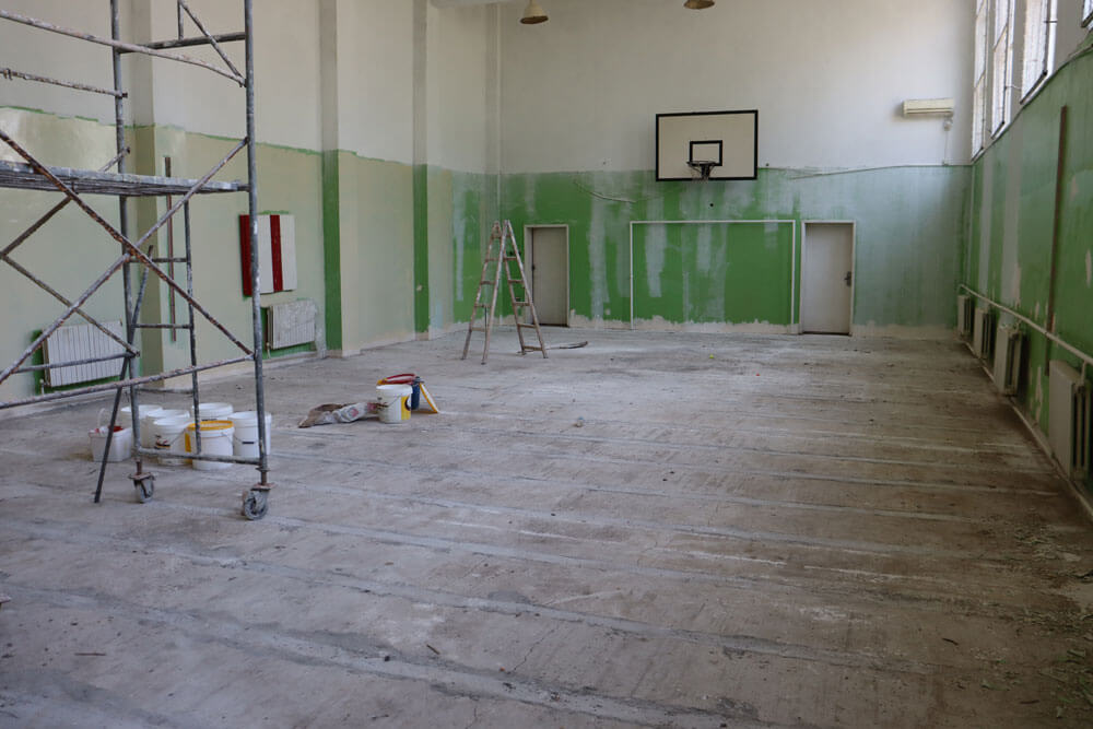 Прави се подмяна на настилката и цялостно обновяване на физкултурния салон. Фирмата-изпълнител работи и по нова хидроизолация на покрива на старата част на школската сграда.